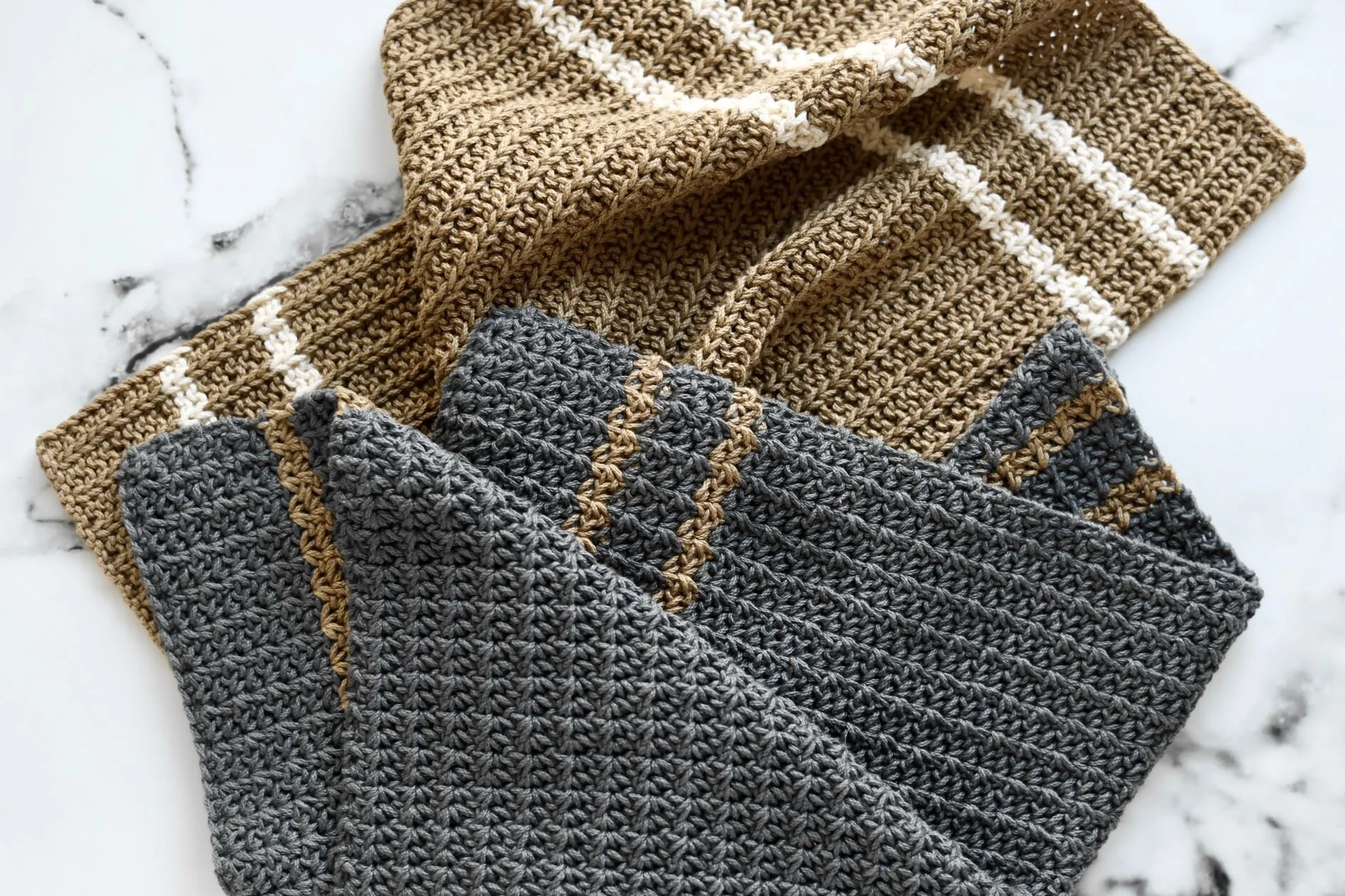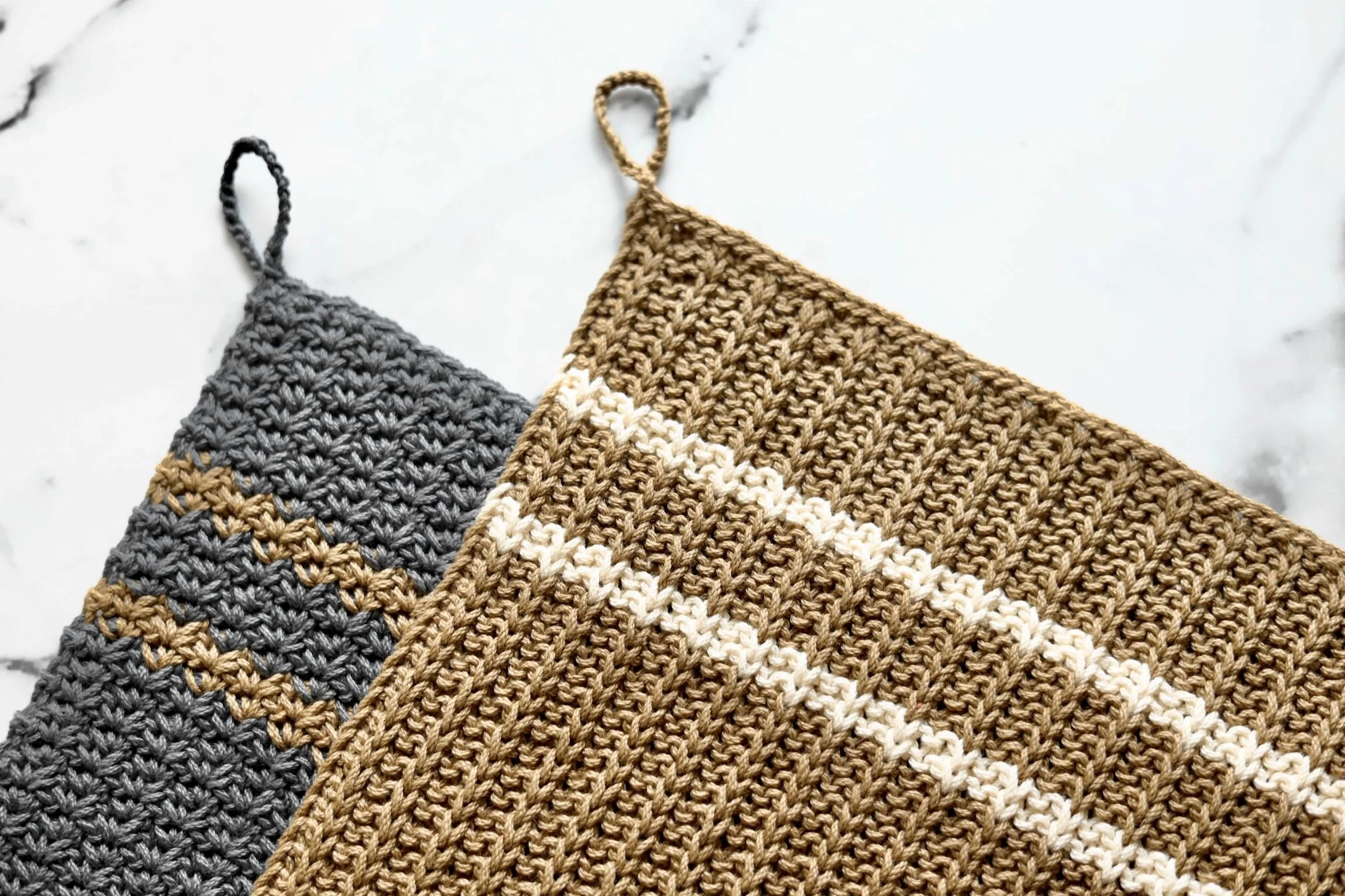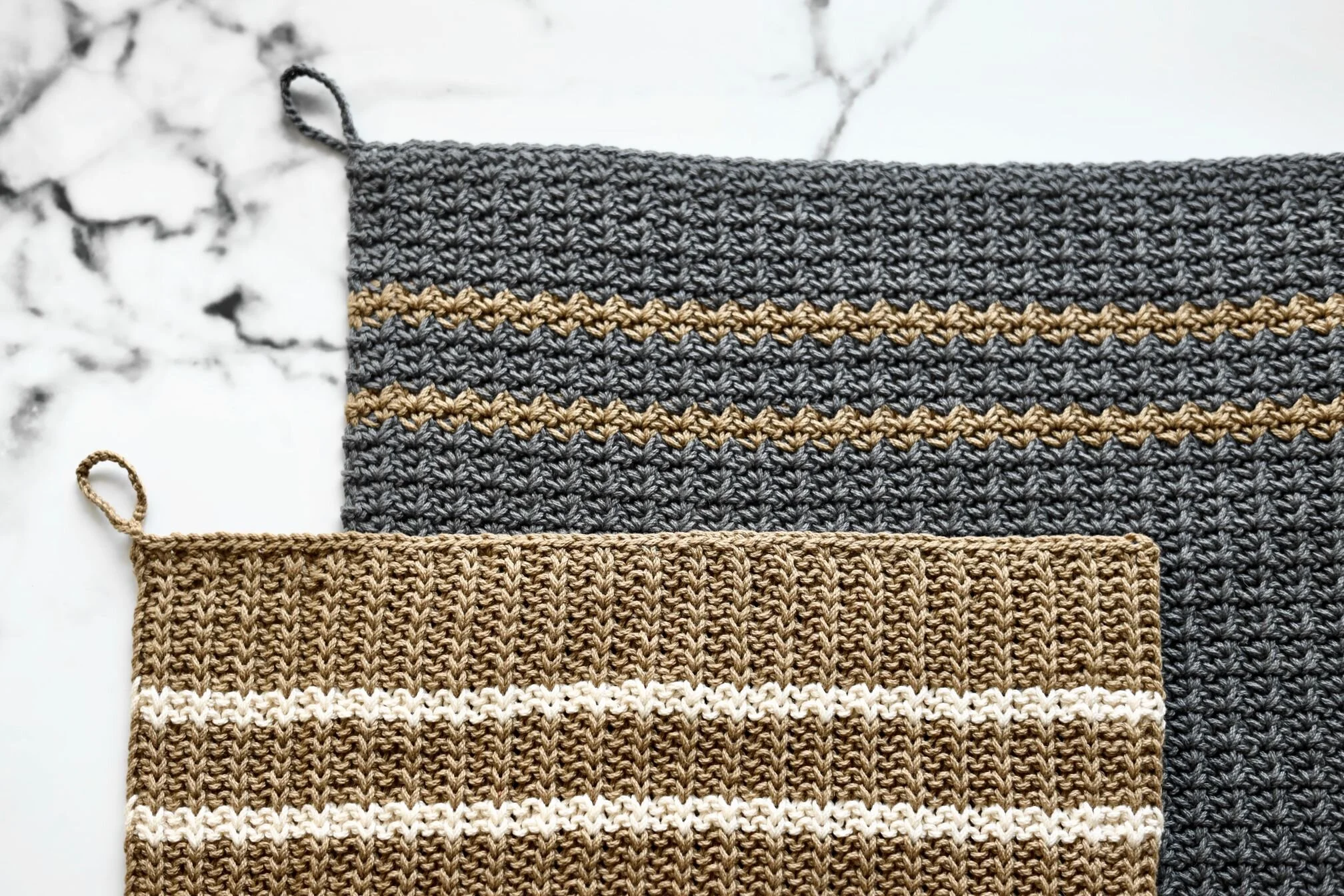 The Mercantile Kitchen Cloth is an easy level crochet pattern and the techniques involved are single crochet, chaining and skipping stitches, working into chain spaces, and changing colors at the end of a row.