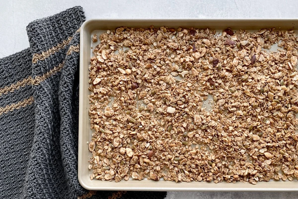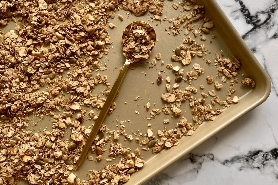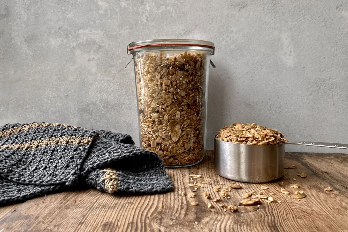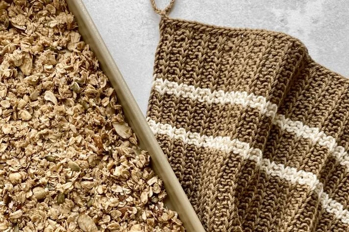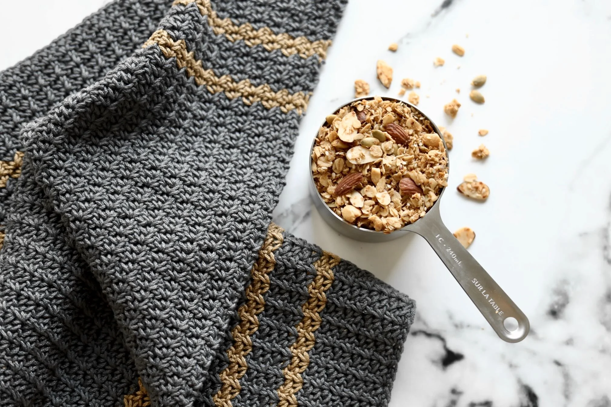 In addition to the towels, this year I wanted to offer an extra special something. So many of us have taken up a lot more cooking in the past year, and aside from knitting and crocheting, it's one of my favorite activities. I often share recipes and kitchen hacks in my Instagram stories, but I'm excited to start bringing more food and home related content to you across the board. So I figured I'd start with one of my most "famous" recipes - my granola! I use it to top my yogurt, as a cereal with a splash of oat milk, or just as a standalone snack eaten by the handful (once you start you can't stop!). The best part about making your own granola is that you can shop for almost all of the ingredients in the bulk food section of your grocery store. You can bring your own reusable containers to fill up with all of the ingredients and reduce the packaging waste from purchasing each item individually wrapped or ready-made granola. Hot tip: it’s also cheaper to shop this way!