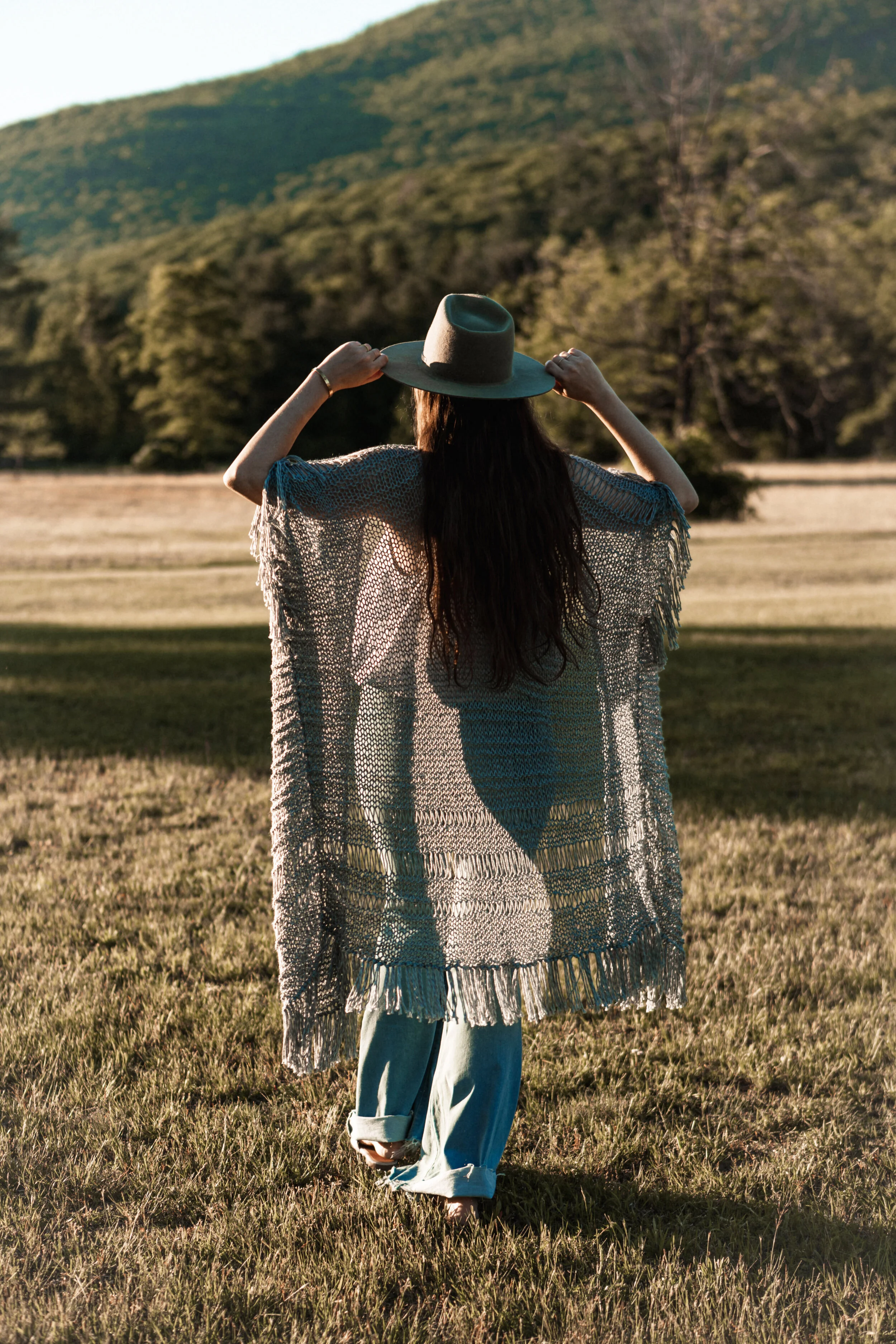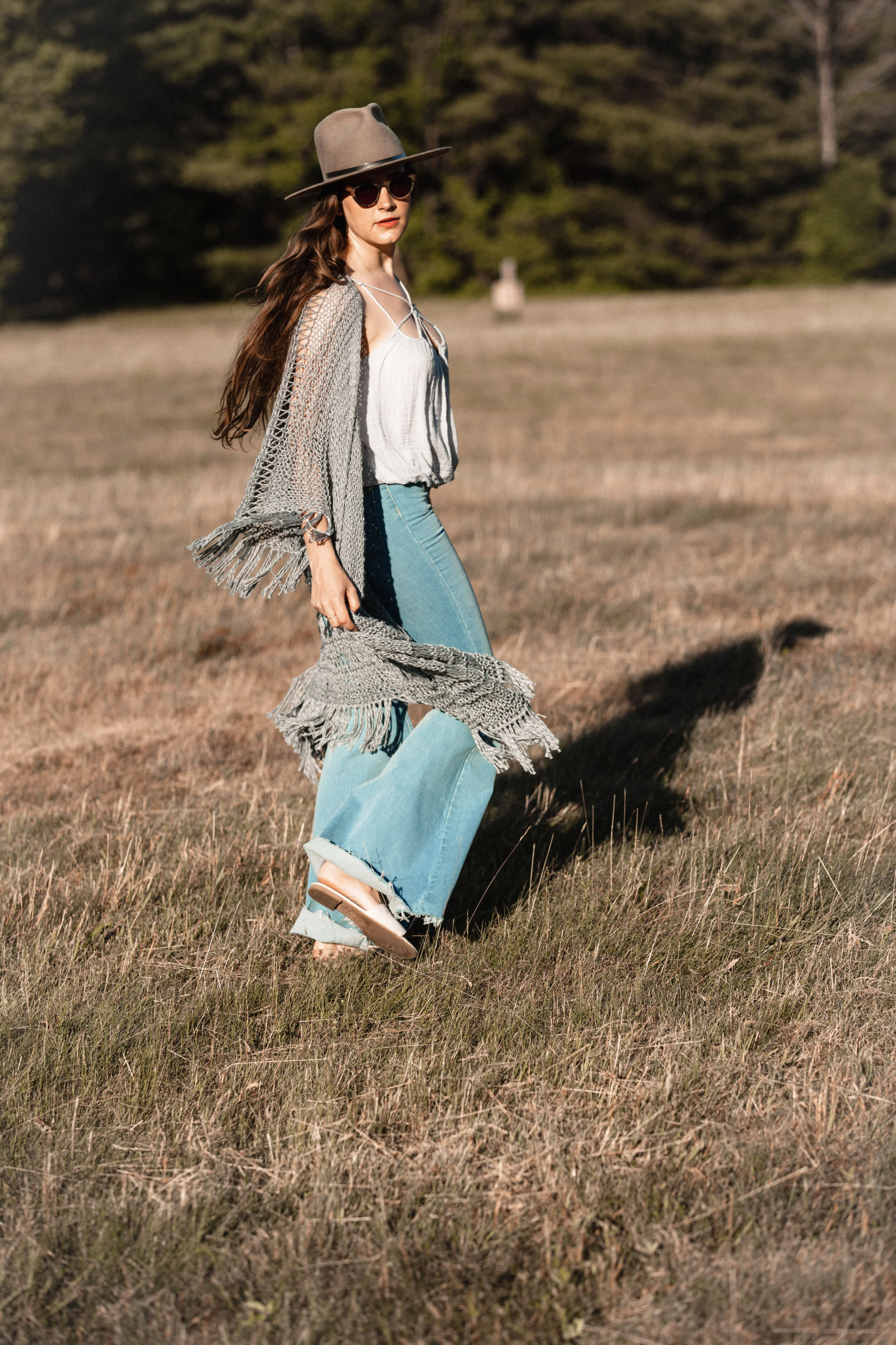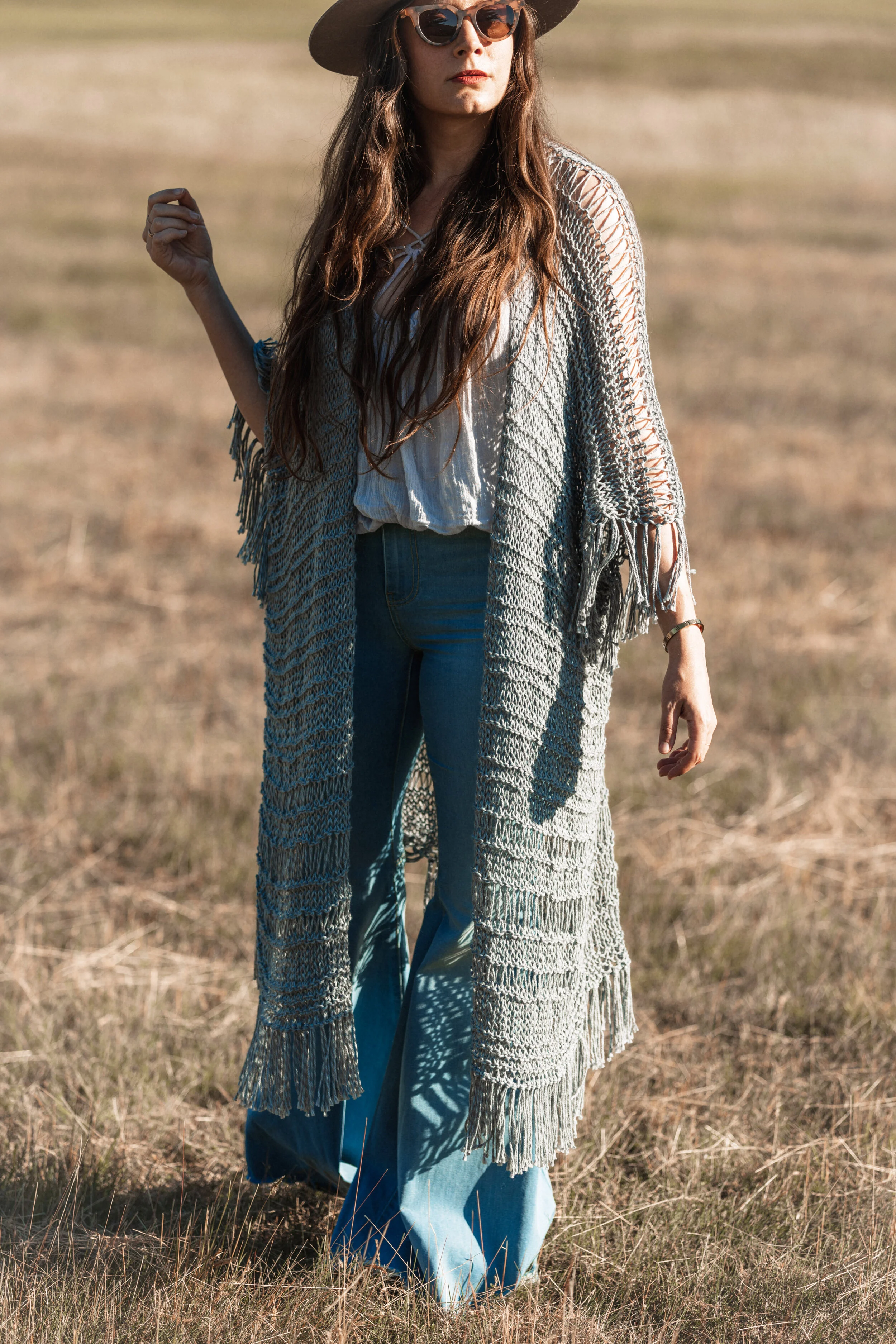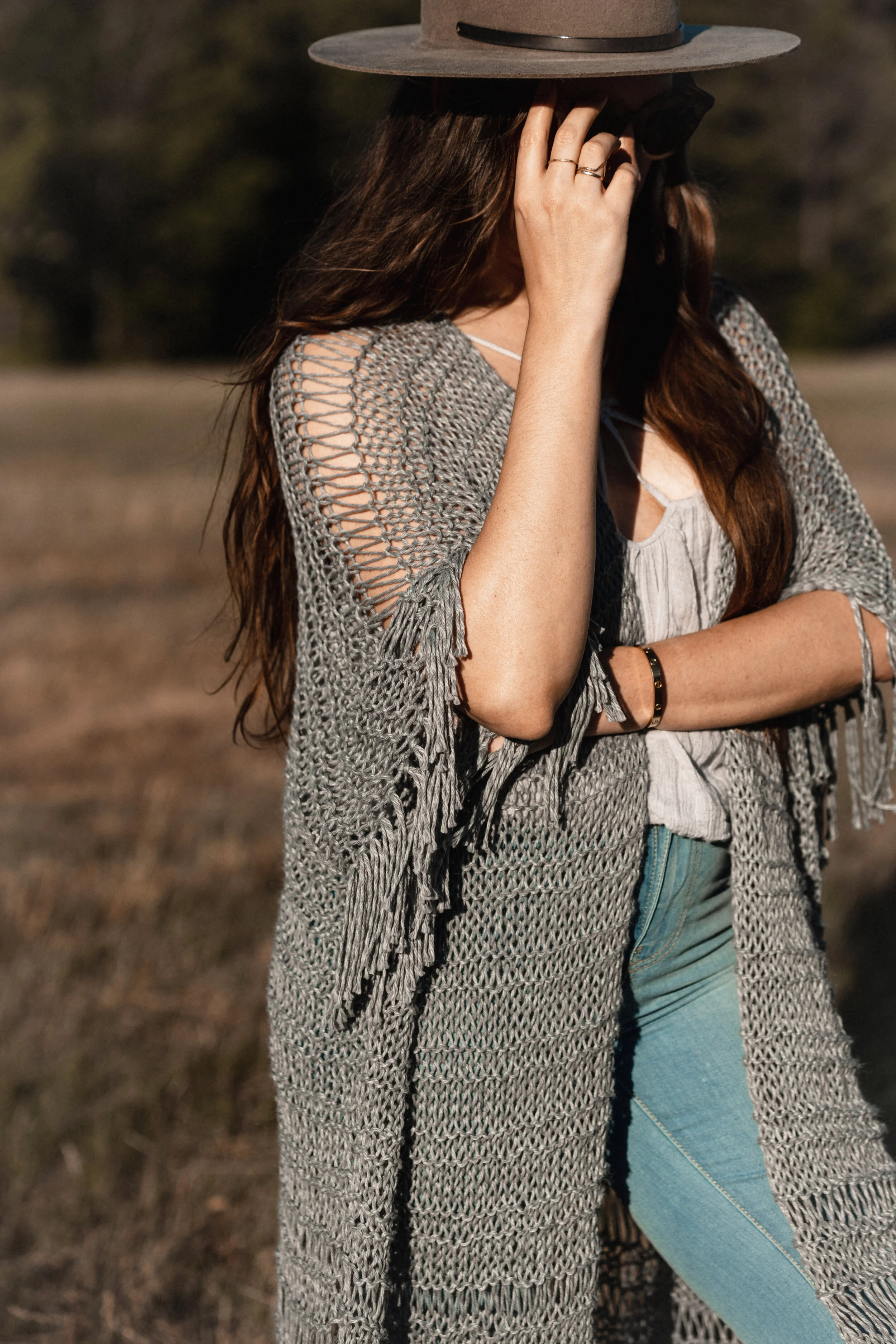 As I mentioned above, I was reminded how lovely Lion Brand's Comfy Cotton Blend yarn is having just used it for my Magic Hour Sweater. It is so very soft and affordable, and makes for a beautiful, lightweight spring or summer project. For this design, I wanted the fabric to be extra gauzy and breathable. I imagine it being picked up in a gust of wind with the fringe flying in all its glory. In order to get the fabric how I envisioned it, I knit it super loose on 10mm needles to create an extra delicate look and feel. The addition of drop stitches added even more airiness and the whole look was complete with boho fringe lining the bottom hem and armholes.