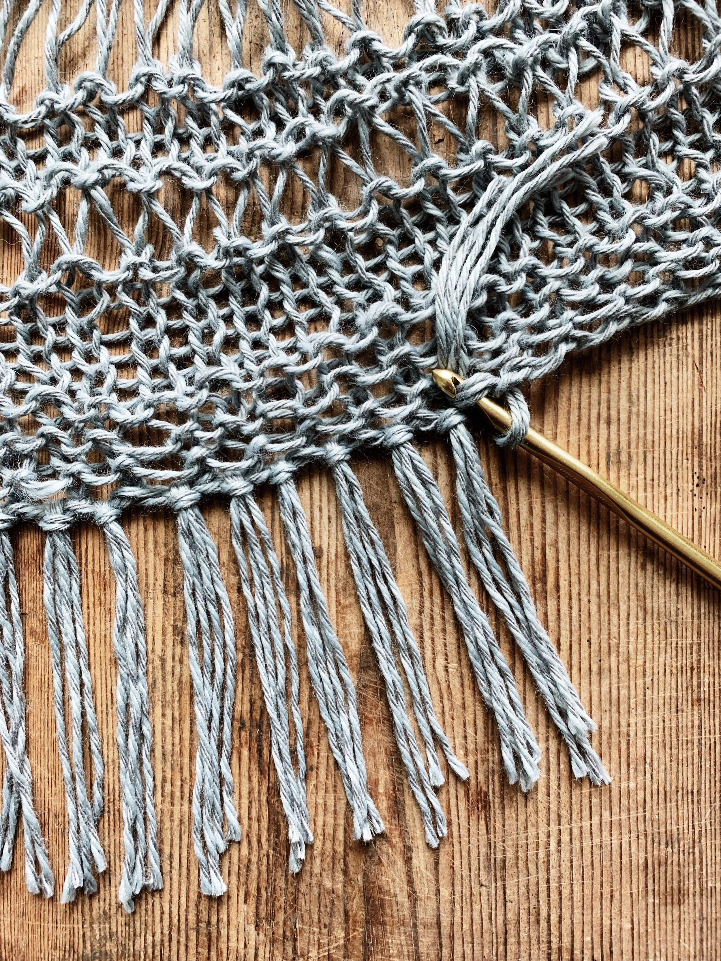 Cut approx. 420 (460, 510, 550) 9”/23cm lengths. Use larks head knots to attach double strands of fringe into each stitch along the bottom edge of the duster. To do so, hold two strands together and fold in half, insert the crochet hook up through a stitch along the bottom edge, place folded loop around the hook and draw it back down through the stitch, then use the hook to grab the ends and draw them through the folded loop. Attach fringe in the same manner around armholes, approx. every other row.