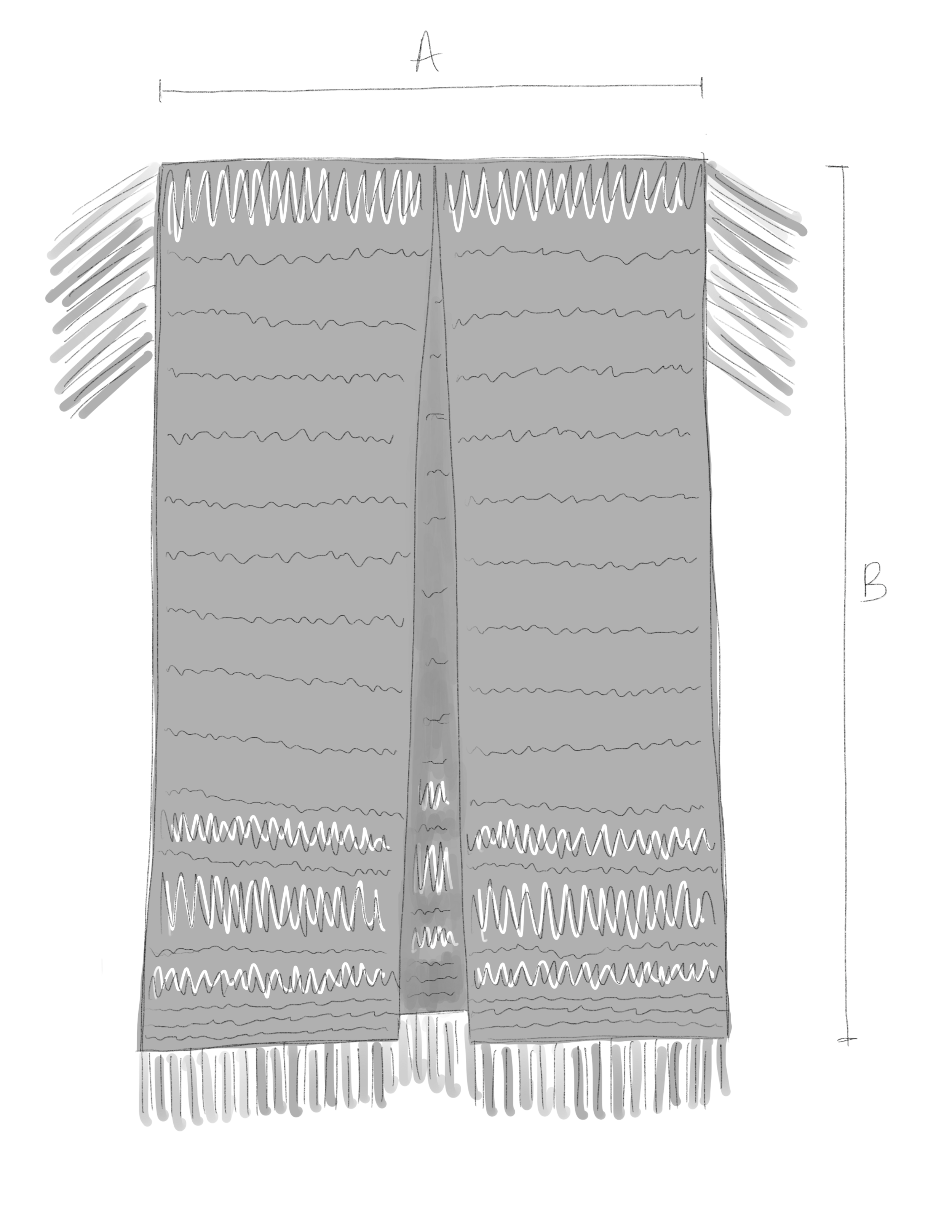 Measurements taken with garment laying flat without fringe. Fabric has significant drag and stretches approx. 8-10”/20.5-25.5cm lengthwise when worn.