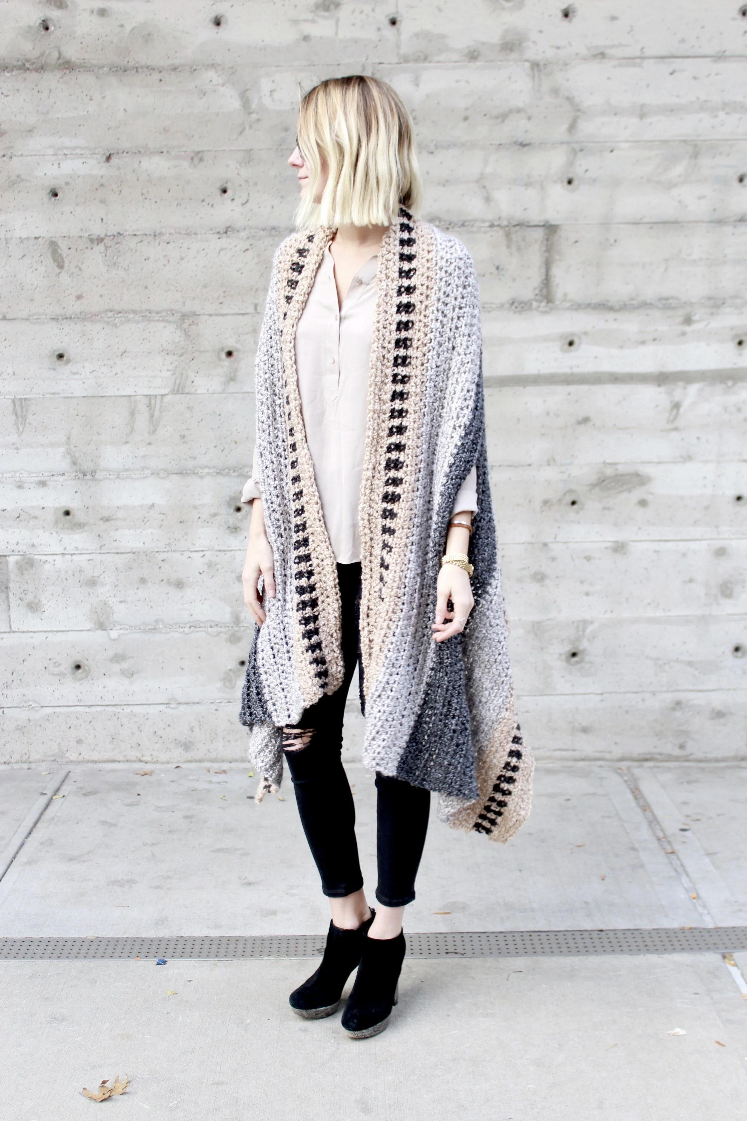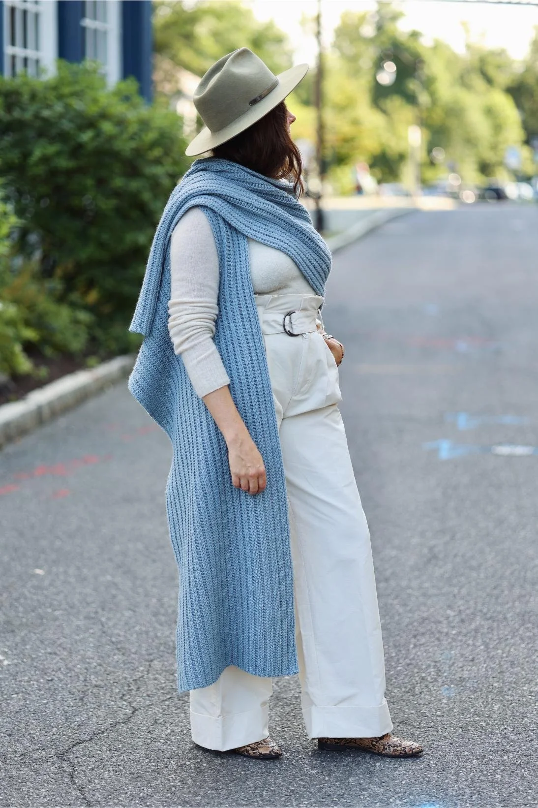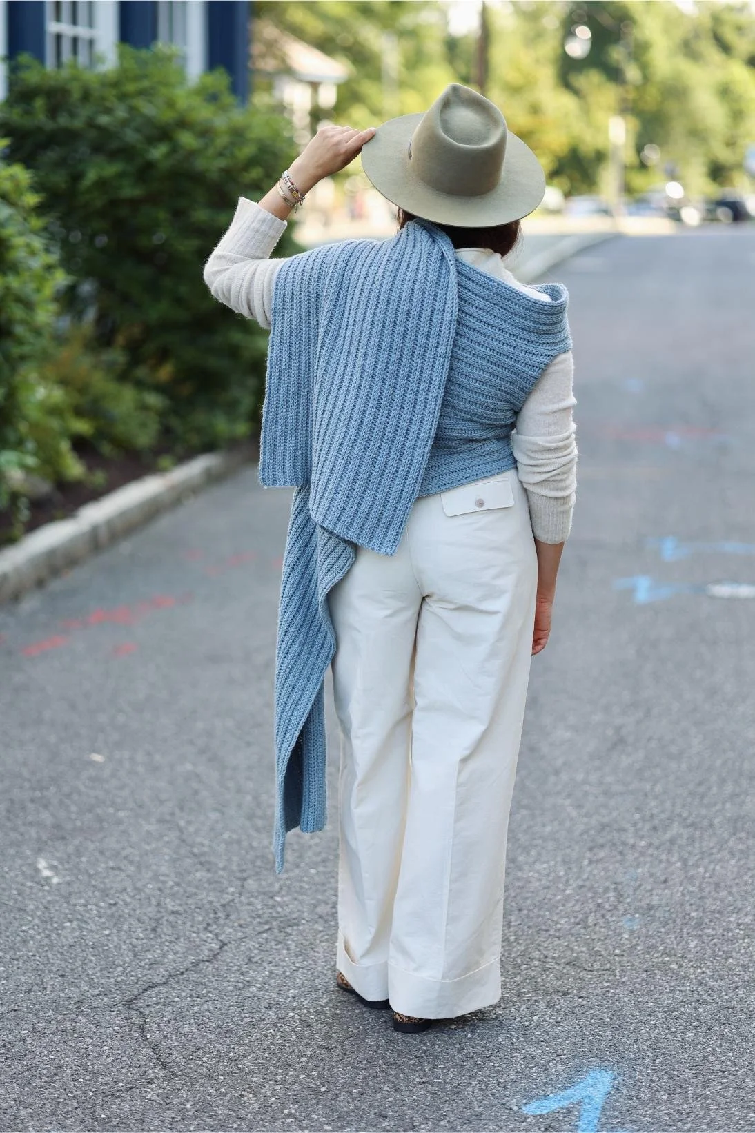 I’m no stranger to a garment shaped like this, having designed my crochet Saddlebrook Cape Scarf in 2016 and the knit Alphabet City Cape Scarf in 2018. These two designs have a wider fabric with armholes at elbow level, creating a silhouette that’s more like a shawl. This style can really only be worn in one way, but it’s such a cozy concept and the placement of the armholes helps keep the shawl in place, almost like a wearable blanket!