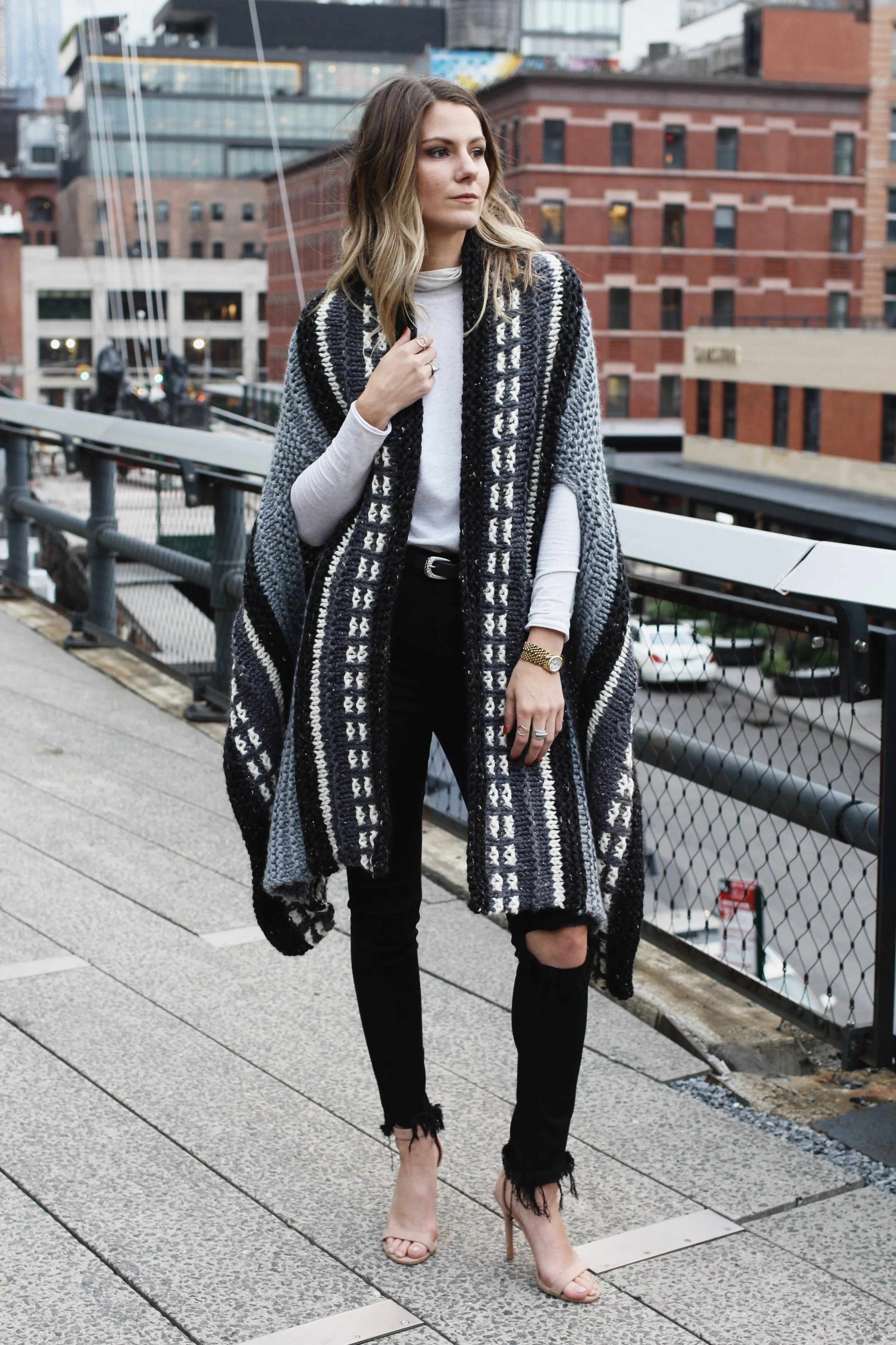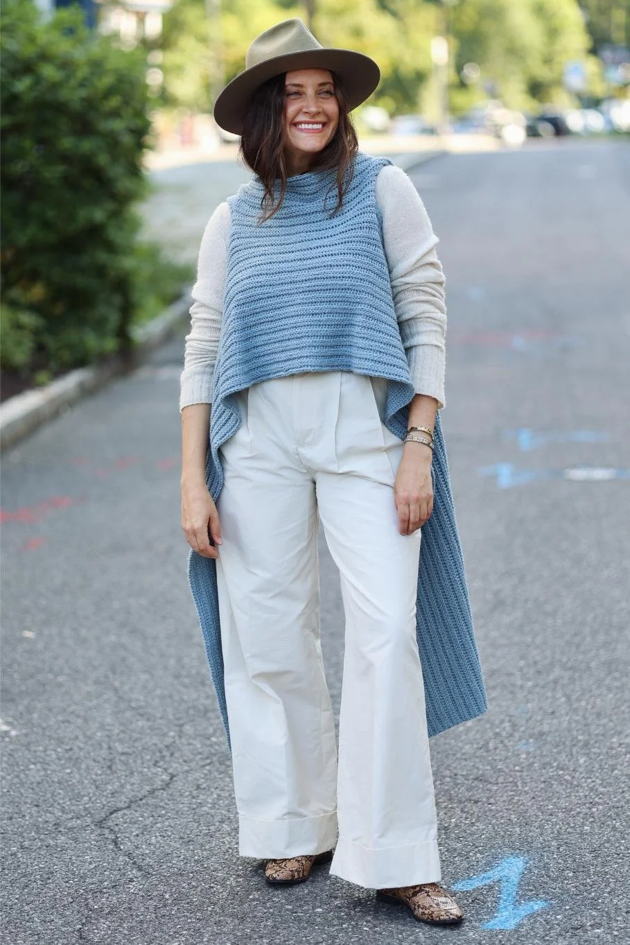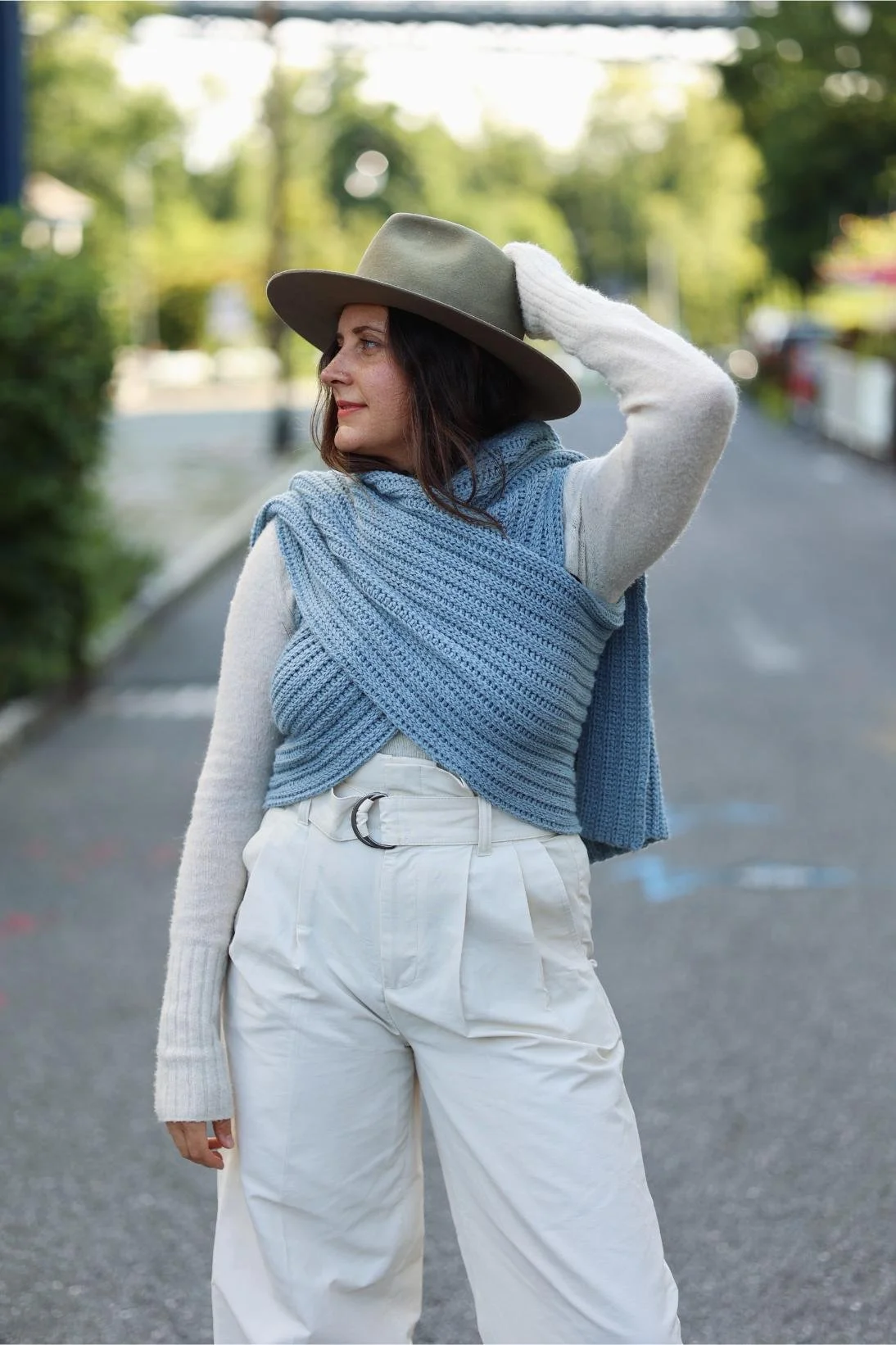I’m no stranger to a garment shaped like this, having designed my crochet Saddlebrook Cape Scarf in 2016 and the knit Alphabet City Cape Scarf in 2018. These two designs have a wider fabric with armholes at elbow level, creating a silhouette that’s more like a shawl. This style can really only be worn in one way, but it’s such a cozy concept and the placement of the armholes helps keep the shawl in place, almost like a wearable blanket!