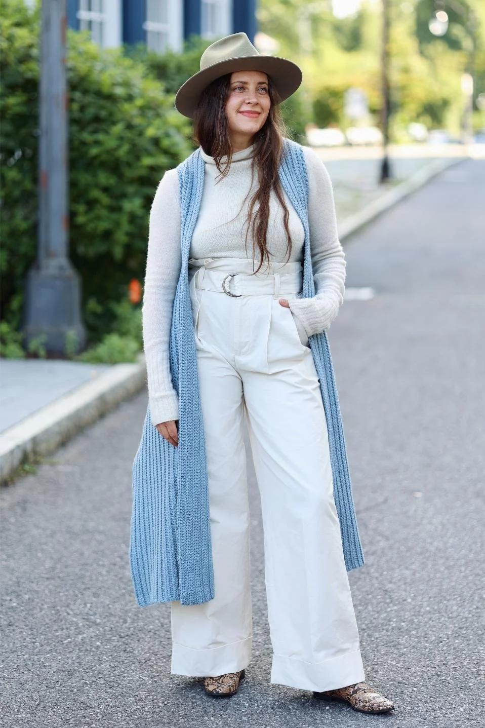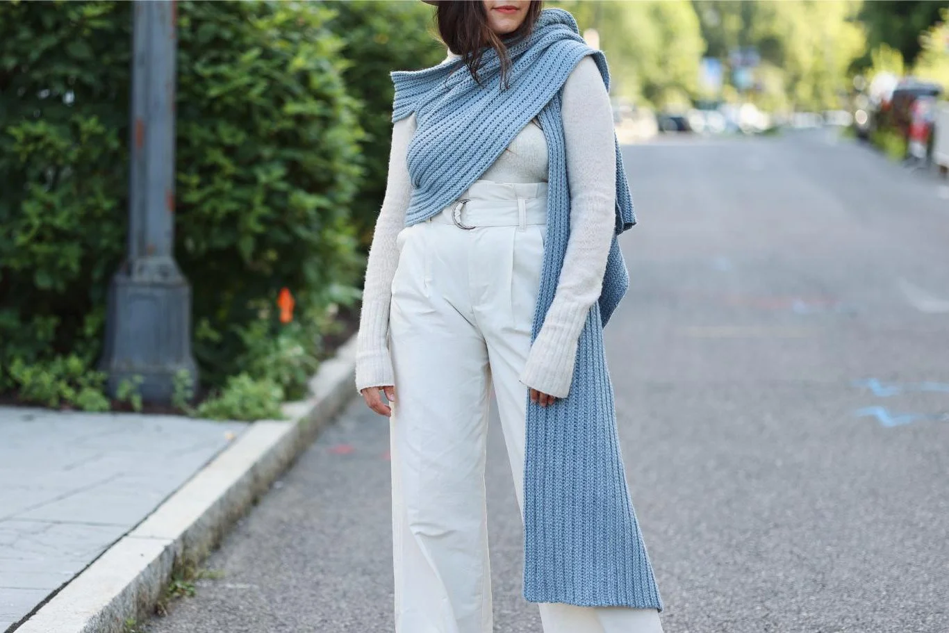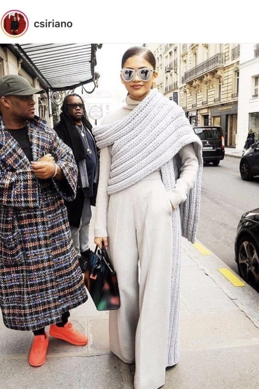 First let’s talk inspo. If you follow pretty much any yarn account on Instagram, you’ve likely seen photos of Zendaya sporting an uber-chic long ribbed wrap that seems to go viral every couple of years. The wrap, originally designed in 2016 by Christian Siriano, is still available in a slightly lighter weight cashmere version that retails for $3200!